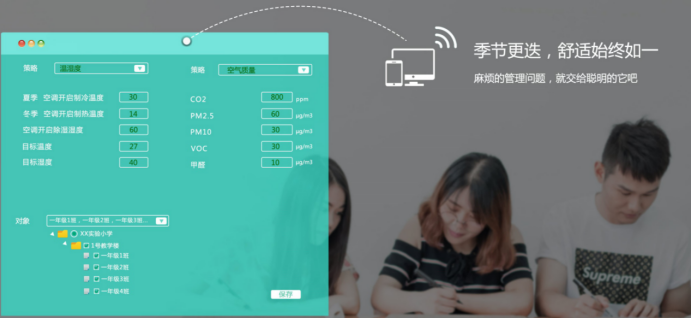 系統可自動識别室内空氣質量情況,根據預設好(hǎo)的目标參數,自動控制新風或空氣淨化系統,將(jiāng)CO2、PM2.5、PM10、VOC等含量控制在優質空氣範圍,爲師生營造健康的空氣質量環境。