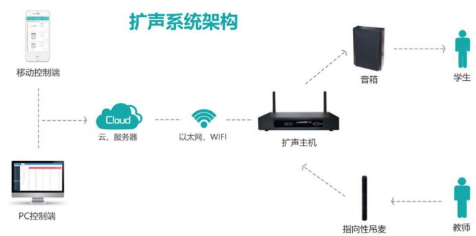 通過(guò)擴聲主機、無線掉麥、音響等設備構成(chéng)一整套智能(néng)擴聲系統讓老師上課更輕松、學(xué)生聽課更高效、設備管理更方便。