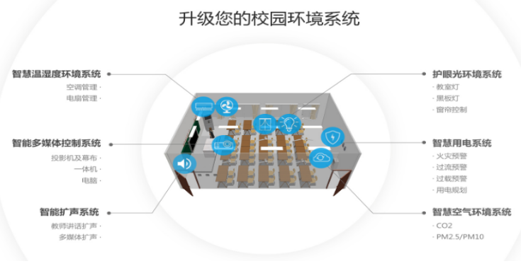 智慧教學(xué)環境包含:智慧照明環境管理、智慧空氣環境管理、智慧用電環境管理、智慧擴聲環境管理。