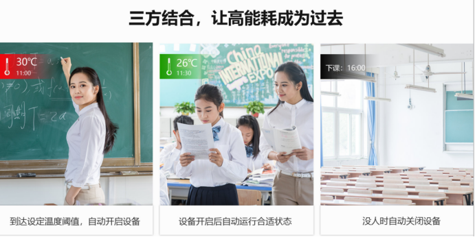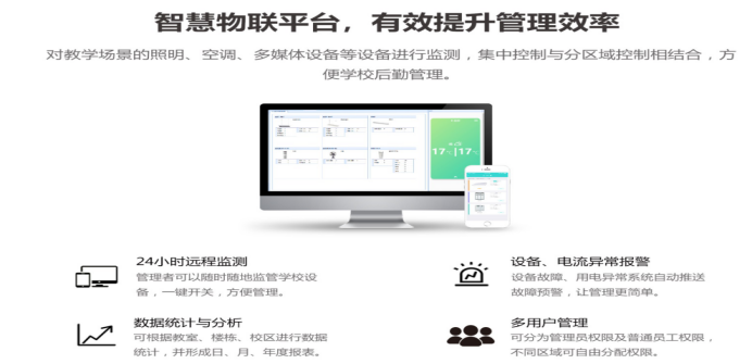 對(duì)教學(xué)場景的照明、空調、多媒體設備等設備進(jìn)行監測、集中控制與分區域控制相結合,方便學(xué)校後(hòu)勤管理。