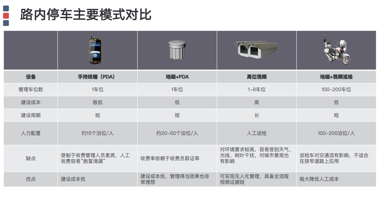 從技術成(chéng)熟度、投資性價比、用戶使用體驗而言,NB-IOT地磁模式是目前智慧路側停車最佳解決方案。我司建議本項目采取的方式爲NB-IOT地磁+PDA的模式。在穩定運營1-2年後(hòu),建議可以部分路段通過(guò)巡檢車模式降低人工成(chéng)本。