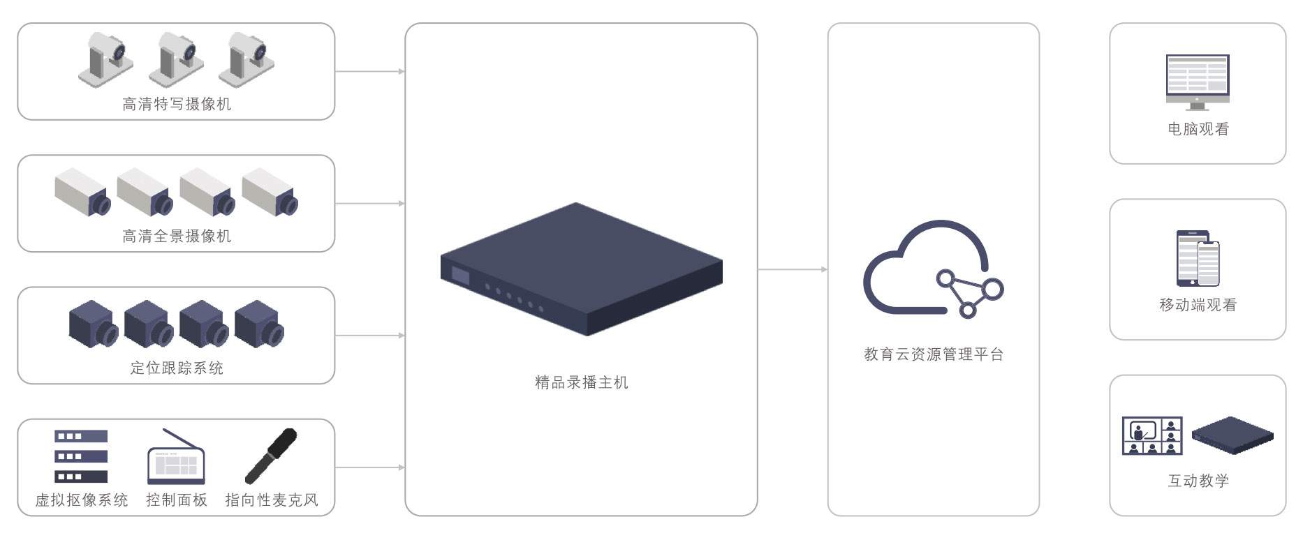 精品錄播教室采用七個機位打造,自動跟蹤記錄上課過(guò)程的多個場景,集合虛拟摳像功能(néng),一室多用,滿足精品課程錄制、遠程互動教學(xué)、虛拟微課制作等多種(zhǒng)需求。